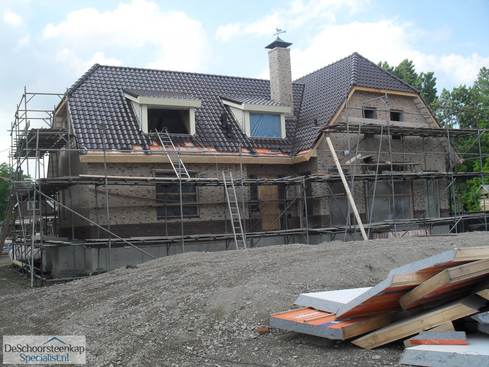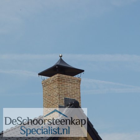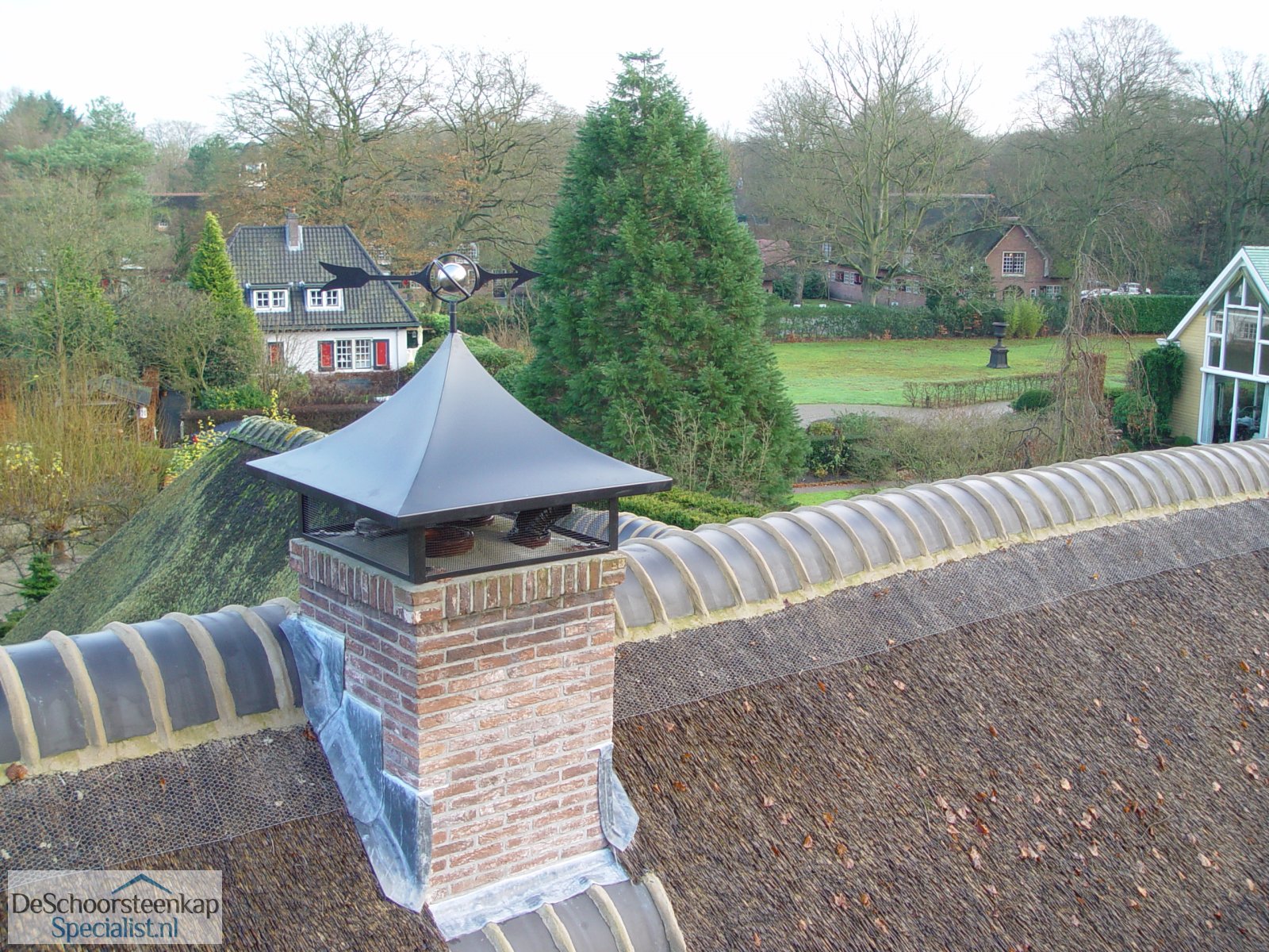 Een getoogde schoorsteenkap met afdekrand op de punt van het dak!