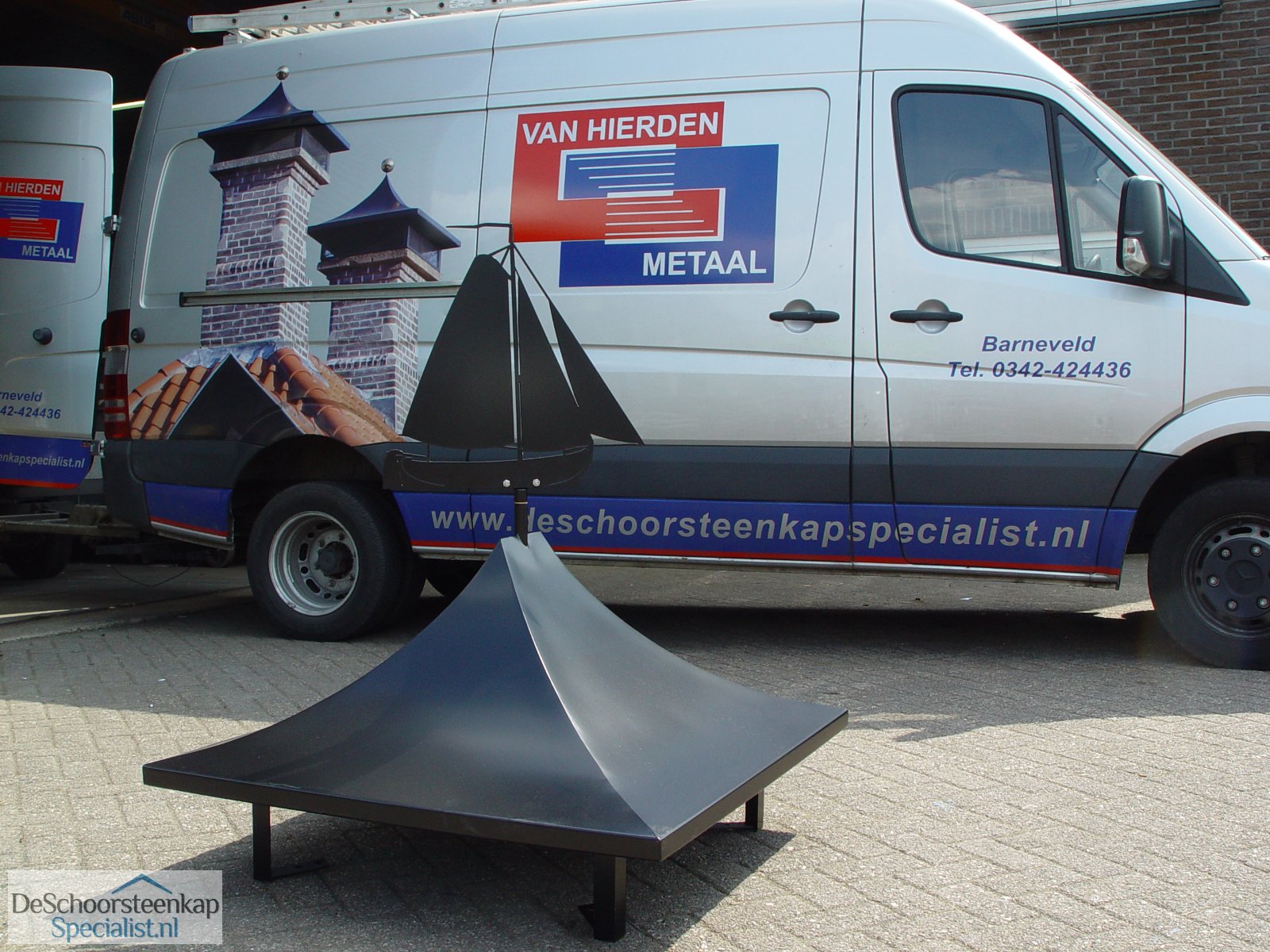 Een getoogde schoorsteenkap met een onderplaat en een windwijzer wereldbol